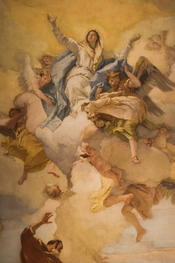 Bianco, oro, manti rigonfi, ali frementi, visi angelici ritrosi, una scala di nuvole striate su cielo chiarissimo, e luce ovunque in questa Assunzione della Vergine di Giambattista Tiepolo. L’altero sguardo della Madonna si placa nel gesto accogliente della preghiera, dell’ascesa, nell’attesa dell’abbraccio ultimo con Dio. In basso, sulla terra, lo sgomento degli apostoli, il sepolcro divelto.