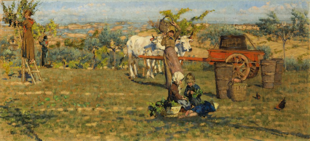 Ritorna con la cesta sulle spalle la ragazza, al centro del quadro, verso i bambini che in primo piano piluccano l’uva. Il più piccolo, in scorcio, dorme con il cappello sulla testa. A sinistra, donne di spalle, operose sulle scale raccolgono i frutti, e li depongono sulle ceste appese e penzolanti dai rami.