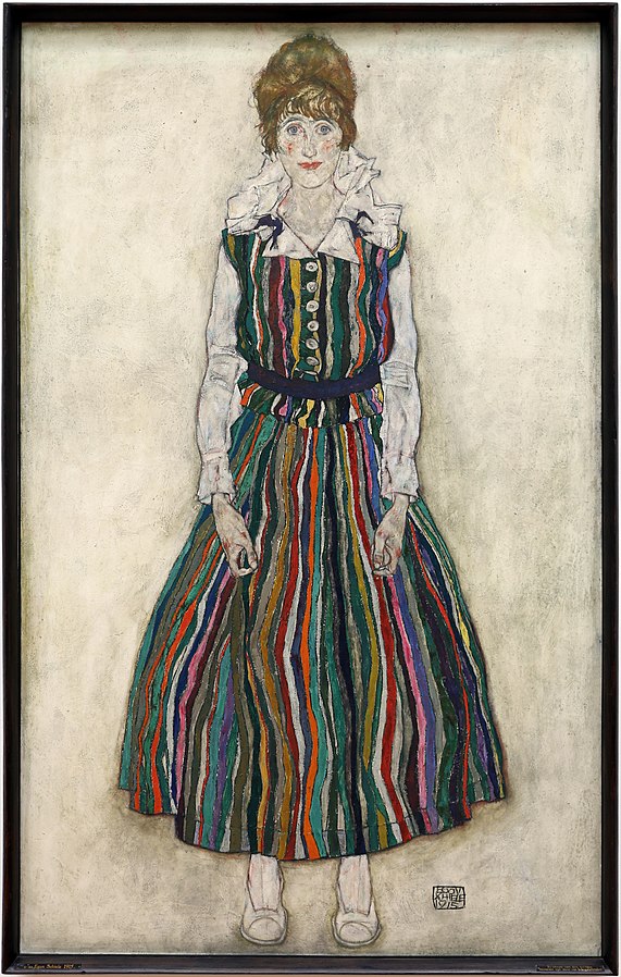 Durante un periodo di congedo dal fronte per malattia, Egon dipingere questo ritratto della moglie, vestita con un abito millerighe, realizzato da lei stessa, con le tende dello studio del marito. L’acconciatura a chignon alto tiene a bada la chioma rossa, il viso candido è imporporato d’imbarazzo, le braccia dritte si frammezzano alle pieghe che interrompono la verticalità delle righe. Le mani semichiuse sono abbandonate in grembo, mentre il colletto candido è frastagliato come una scogliera inglese.