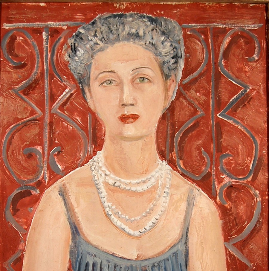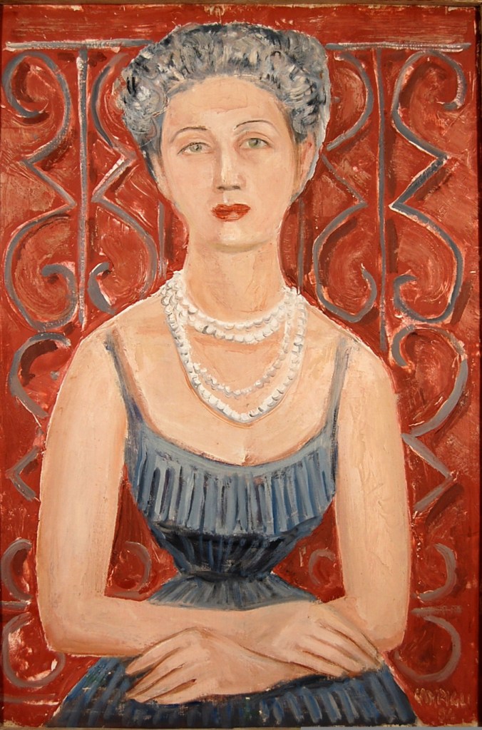 Irene Brin – scrittrice, giornalista di costume, promotrice del Made in Italy nel mondo nel secondo dopoguerra – è ritratta con vitino di vespa stretto nel vestito da sera antracite, illuminato dalla vistosa collana di perle. La figura, contro uno sfondo bruciato scandito da una cancellata dalle inferiate mistilinee, evoca un’esibita e polverosa arcaicità.