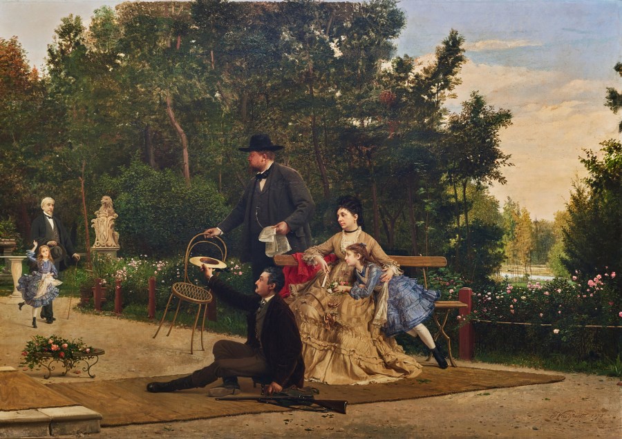 L’ampia terrazza del giardino della tenuta di famiglia è lo sfondo perfetto per un ritratto. La matriarca ha preso posto sulla panchina con la figlia maggiore. Il padre sta posizionando una sedia per accomodarsi, e lo zio (forse) è già seduto a terra con il fucile appoggiata accanto a sé. Agita il cappello per attirare l’attenzione della nipotina, che dal fondo del giardino, sta svogliatamente giungendo scortata dal maggiordomo.