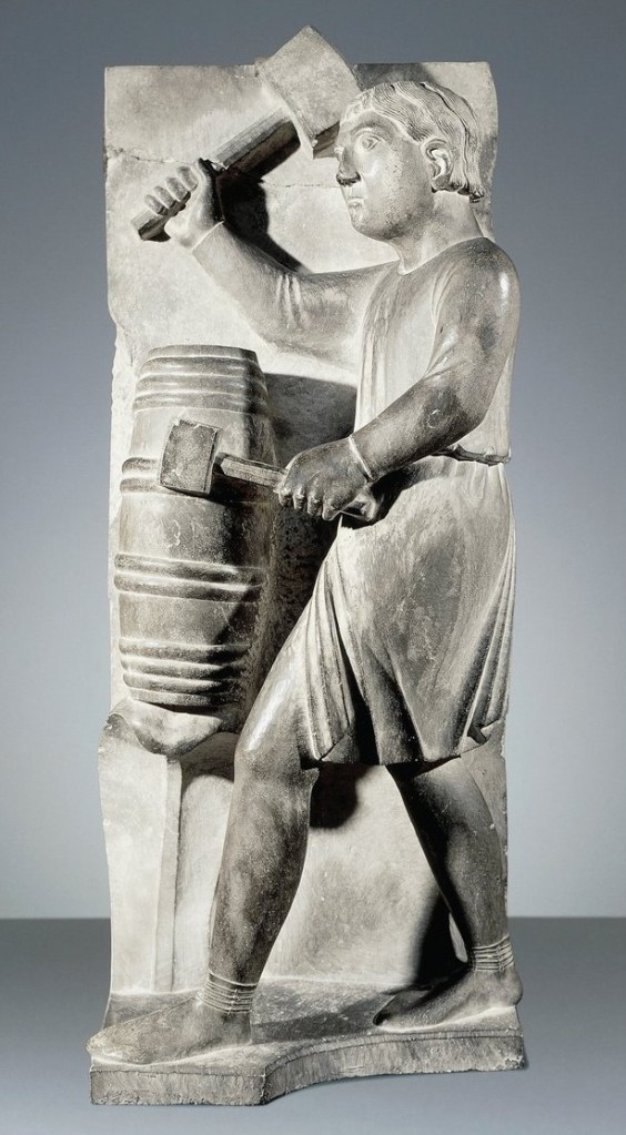 Il contadino è un uomo semplice e curato, indossa i calzari e una corta tunica, stretta in vita da una cintura. Il lavoro increspa la tunica di pieghe discrete. I martelli sono visibilmente pesanti, ma questo non intacca la calma del suo volto. C’è tutta la consapevolezza salvifica dell’operare del cristiano che lo pervade e lo rende un esempio.