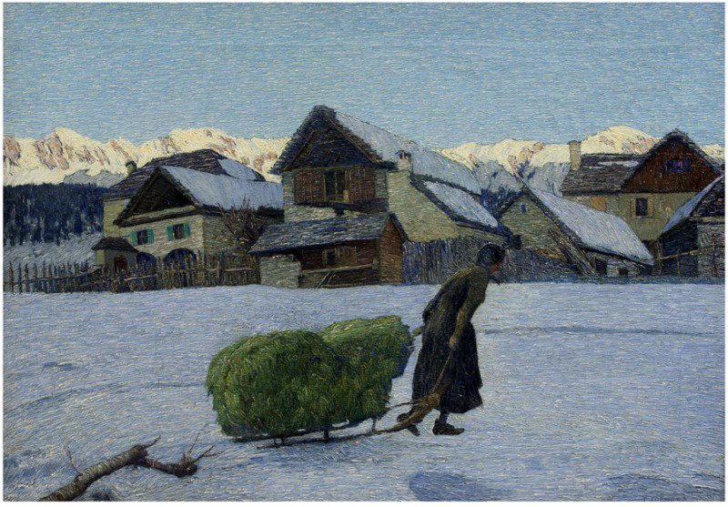In alcune tele si abbandona a suggestioni simboliste: le leggende degli spiriti delle montagne prendono la forma di fate danzanti che vestite di veli ondeggiano sui tetti e spargono il candido manto come in un rito iniziatico sospeso tra misticismo e seduzione.