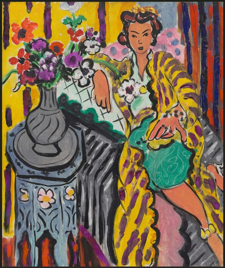 La modella, forse Lydia Delectorskaya, musa di Matisse, è seduta accanto a un tavolino decorato con un vaso di fiori variopinti. La veste gialla con venature viola, seducente e gioiosa, attira subito l’attenzione per contrasto con il verde della gonna. Tutto nell’opera segue un andamento sinuoso, in cui le linee fluide chiudono colori armoniosi e brillanti