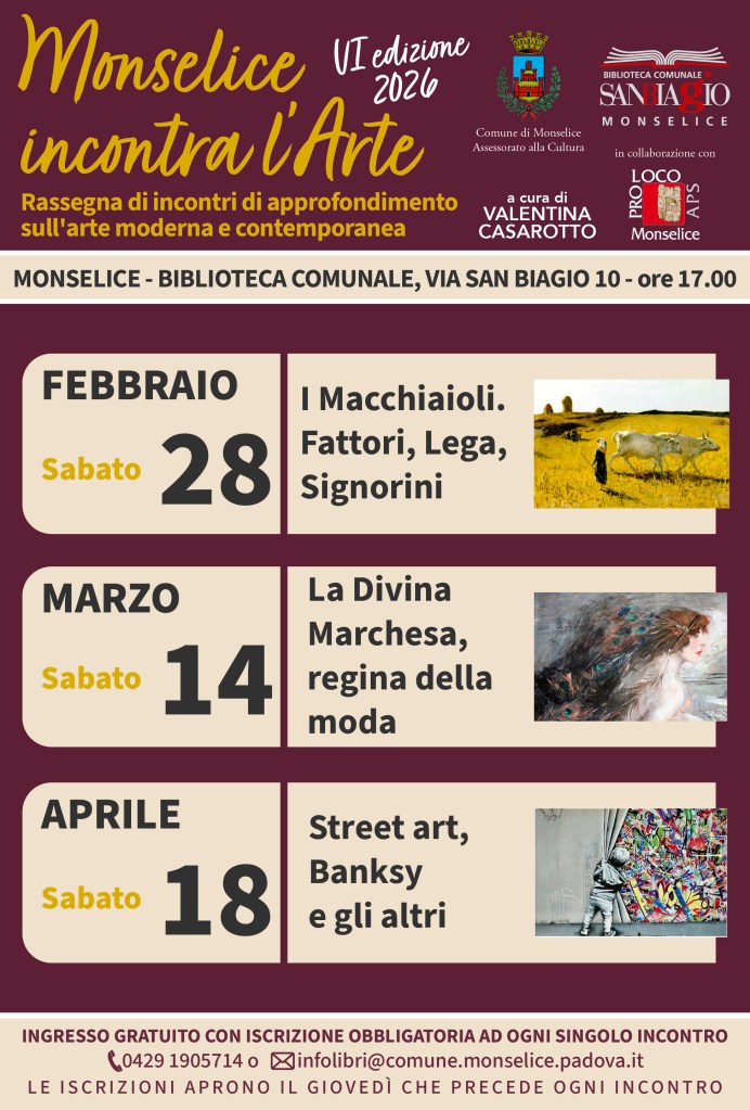 La Biblioteca comunale San Biagio organizza la VI rassegna di incontri “Monselice incontra l’Arte” di approfondimento sull’arte moderna e contemporanea.